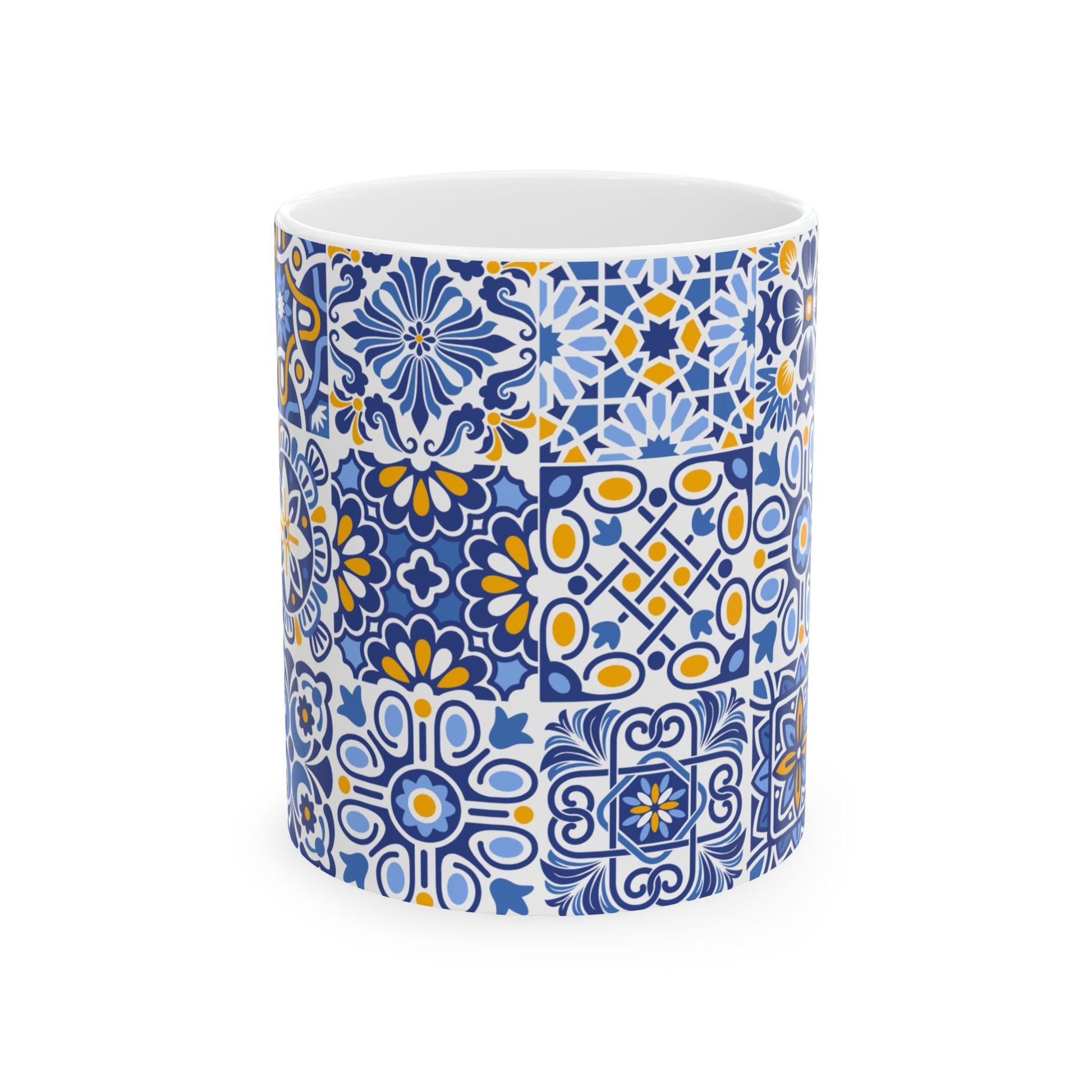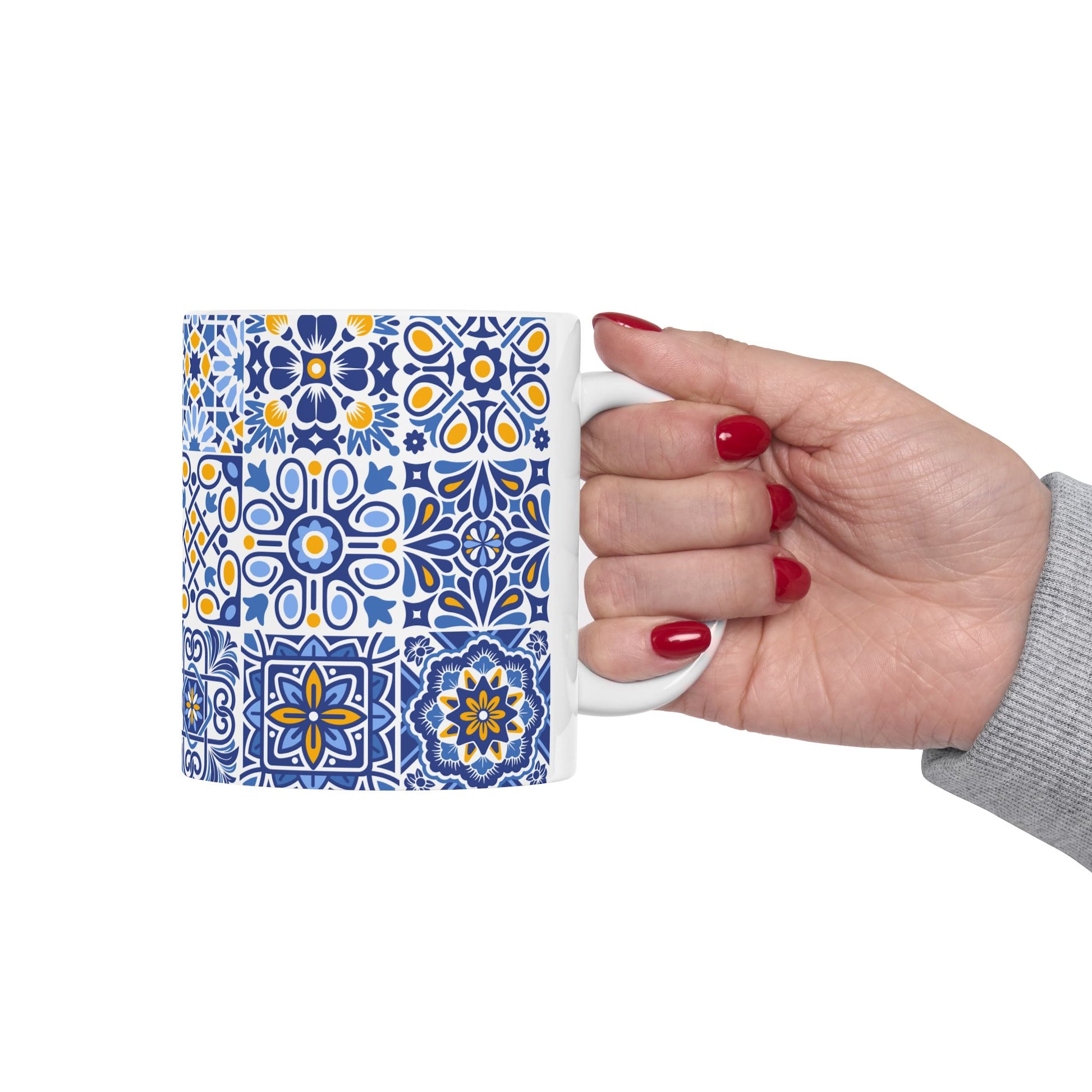 Bright, hand-tile inspired ceramic mug that brings Mediterranean mornings to your countertop. Deep cobalt blues and warm sunlit yellows form a repeating patchwork of floral and geometric tiles that looks at home in a sunny kitchen or beside a well-loved recipe book. Hold it by the comfortable C-handle and feel the glossy finish warm under your palm as steam rises. This mug turns ordinary coffee breaks into a small, slow ritual — a moment of color and calm before the day unfolds or during a quiet mid-afternoon pause.