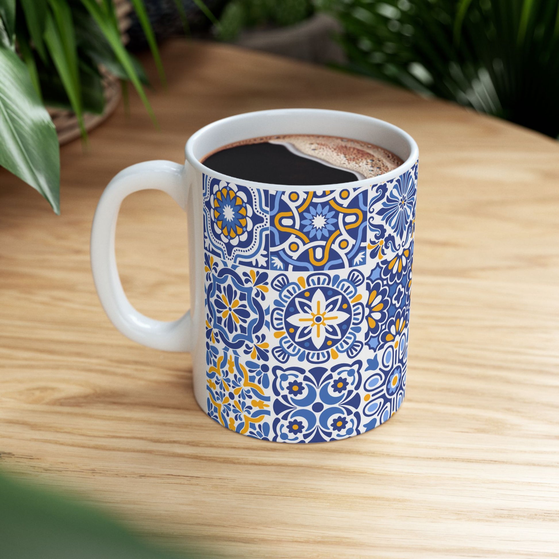 Blue & Yellow Mediterranean Tile Ceramic Mug — Patterned Coffee Cup (11oz/15oz)