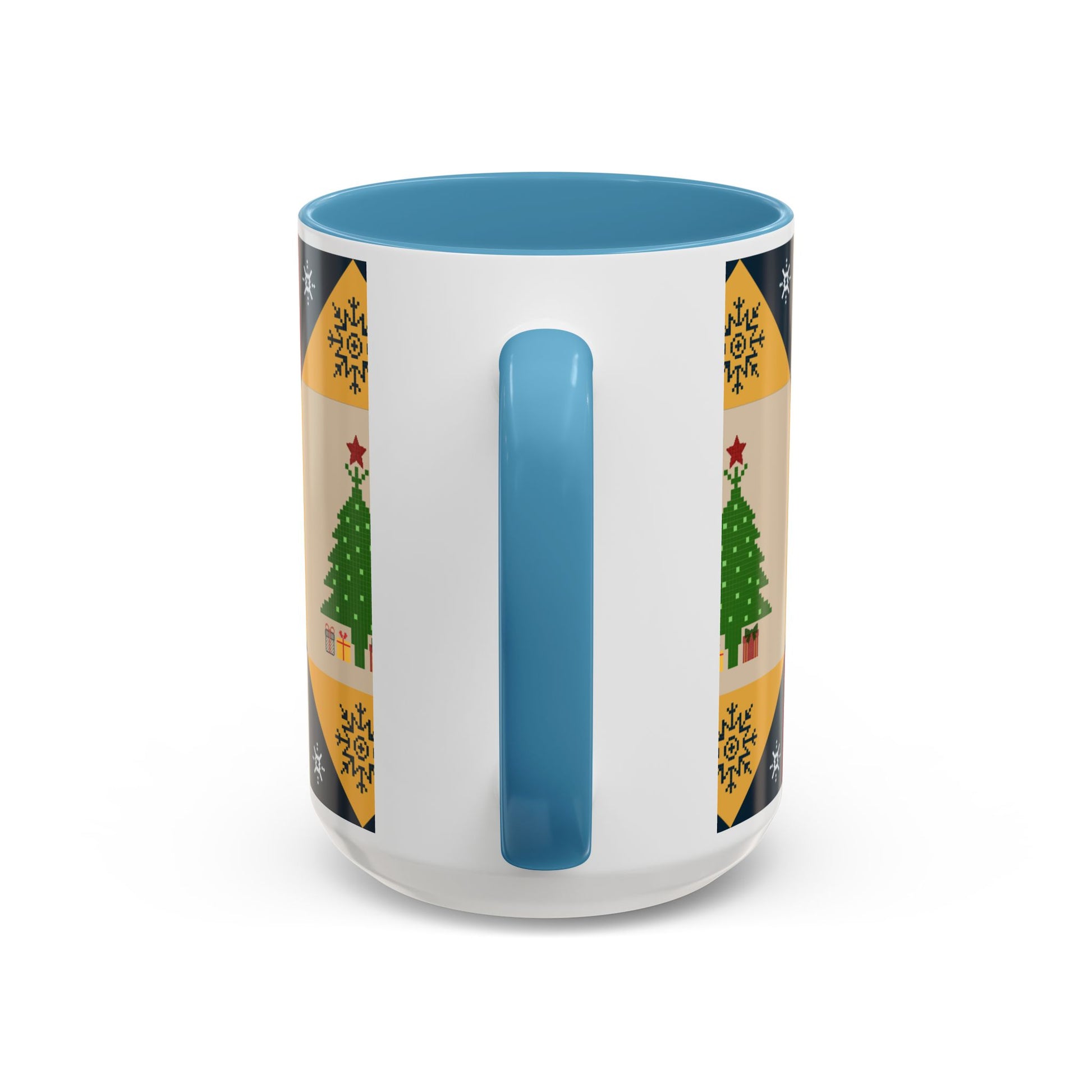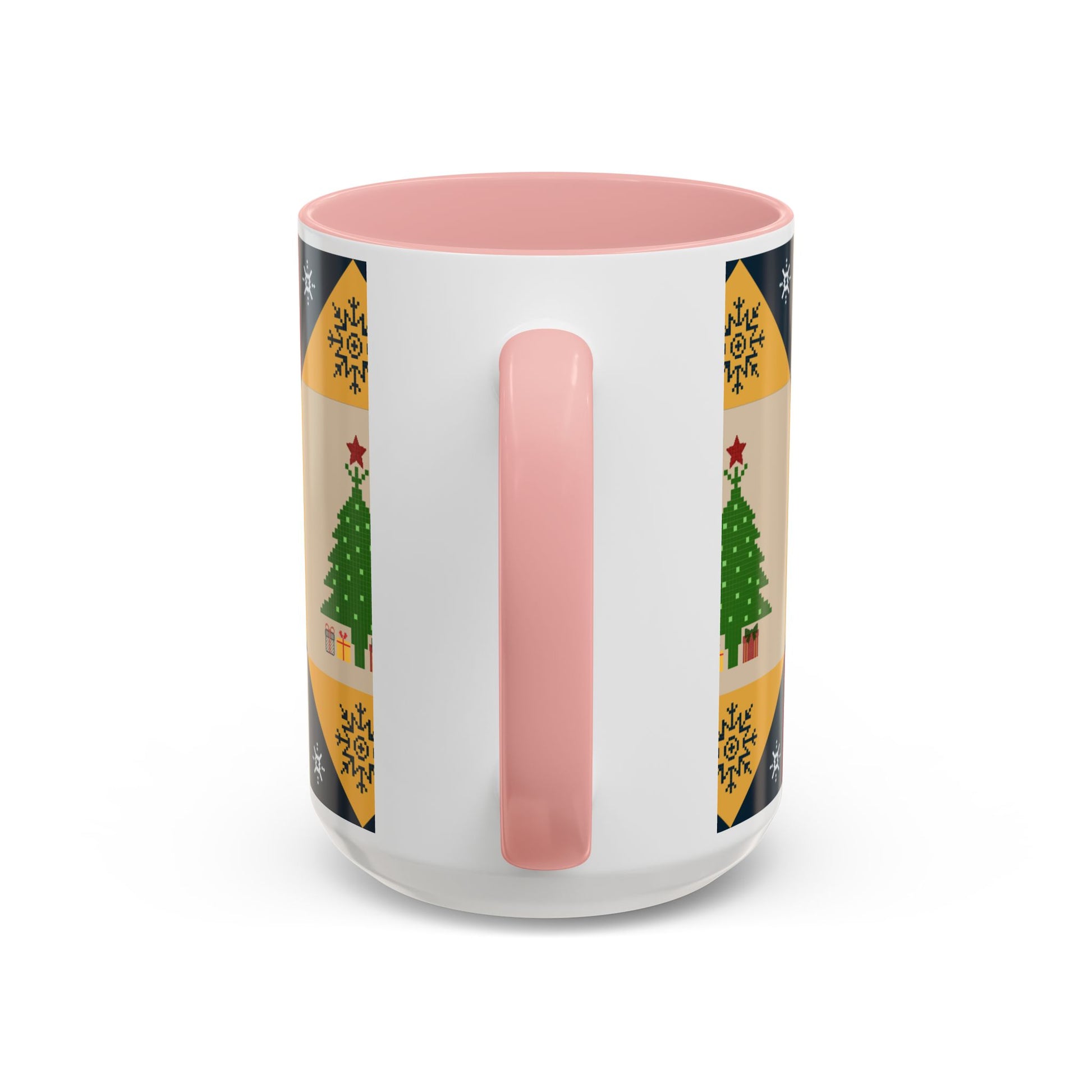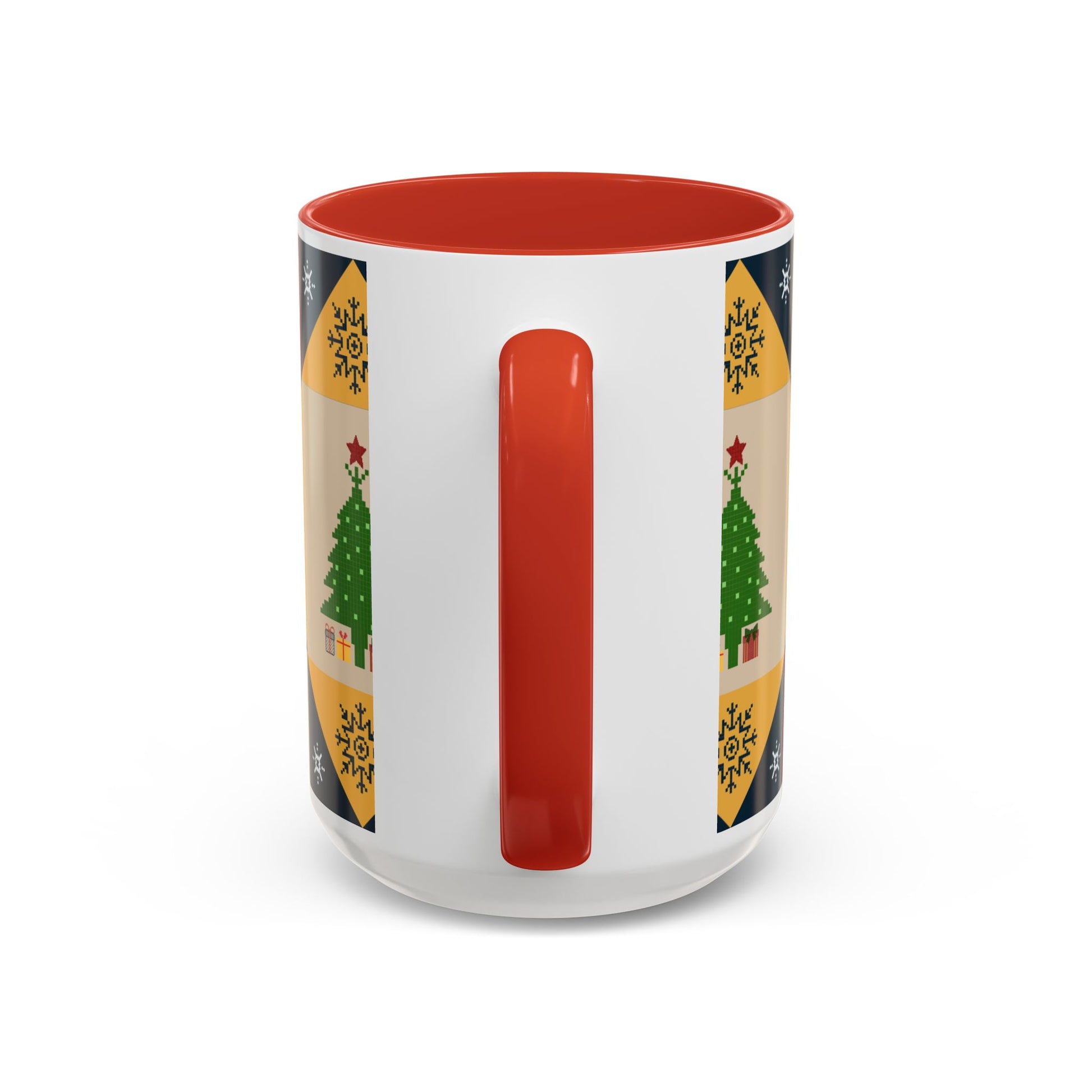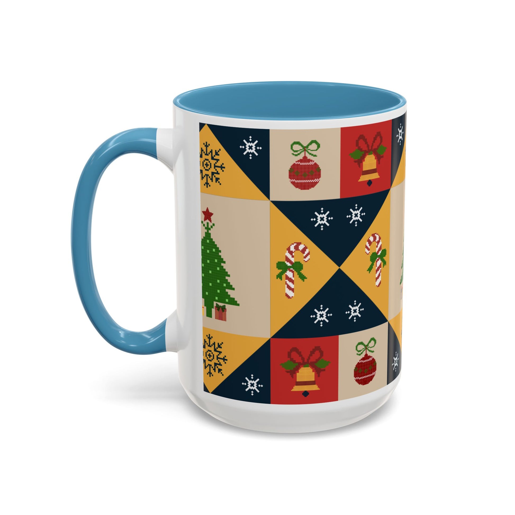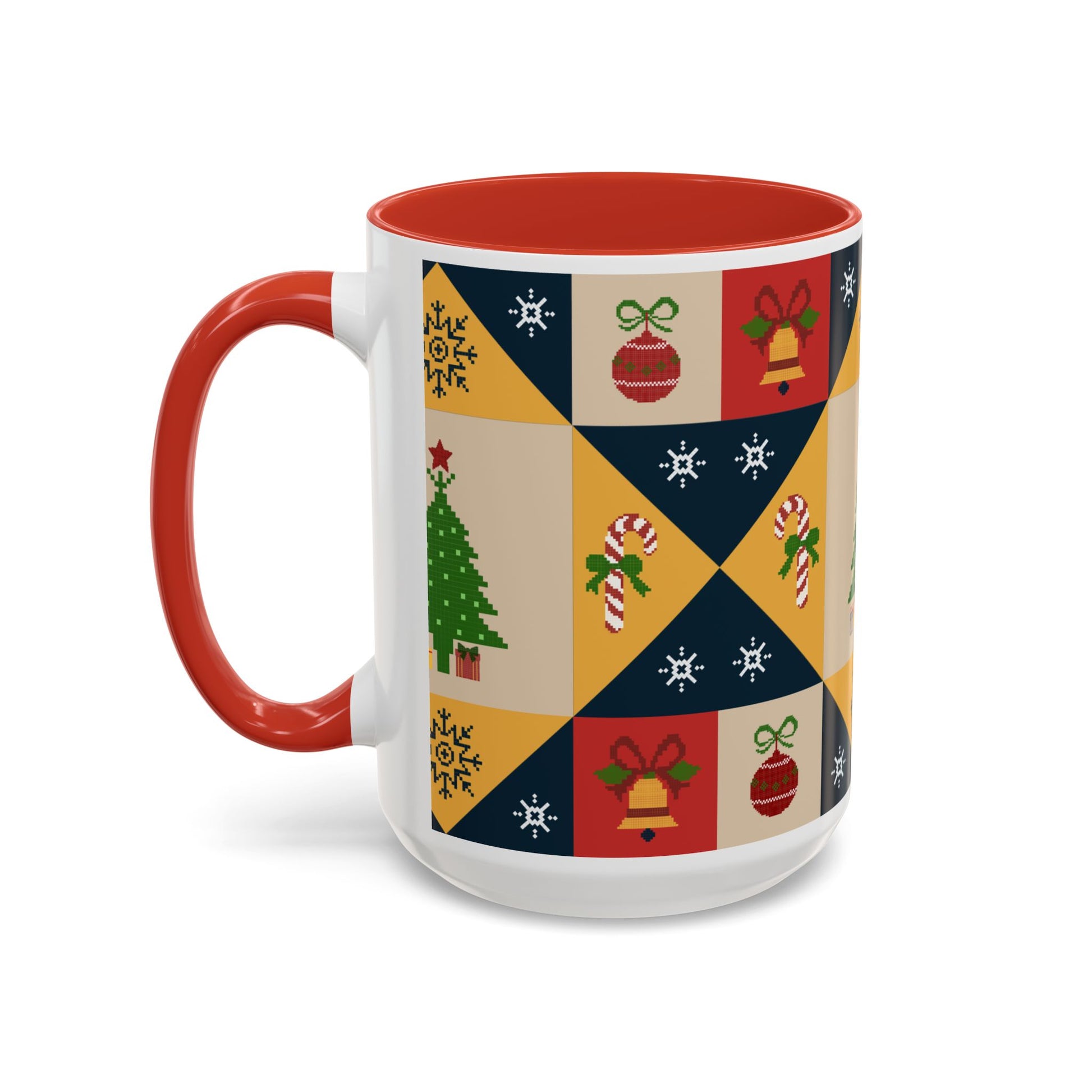 Christmas Quilt Pattern Accent Coffee Mug — Holiday Tree & Ornaments (15oz)